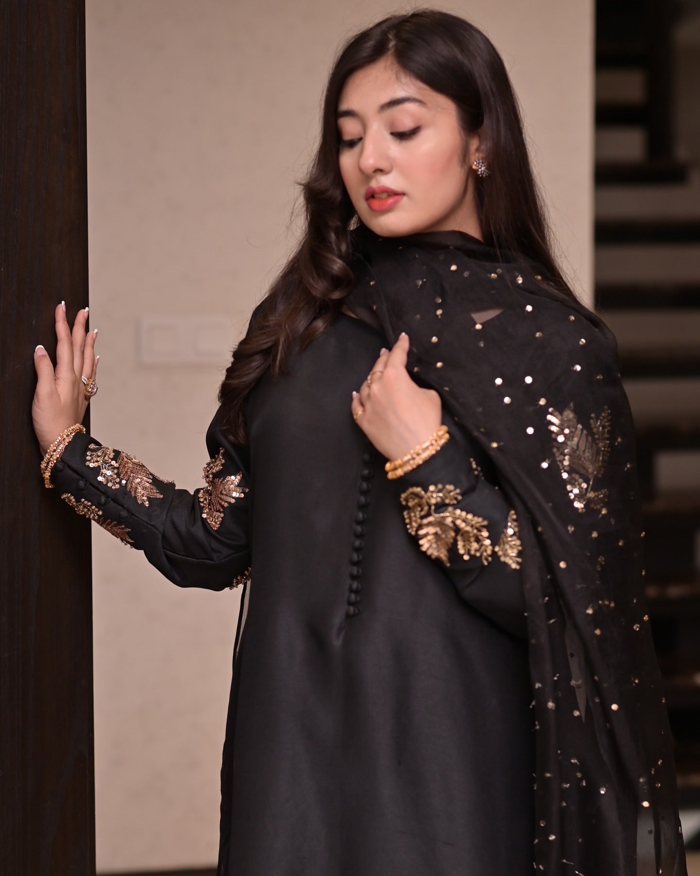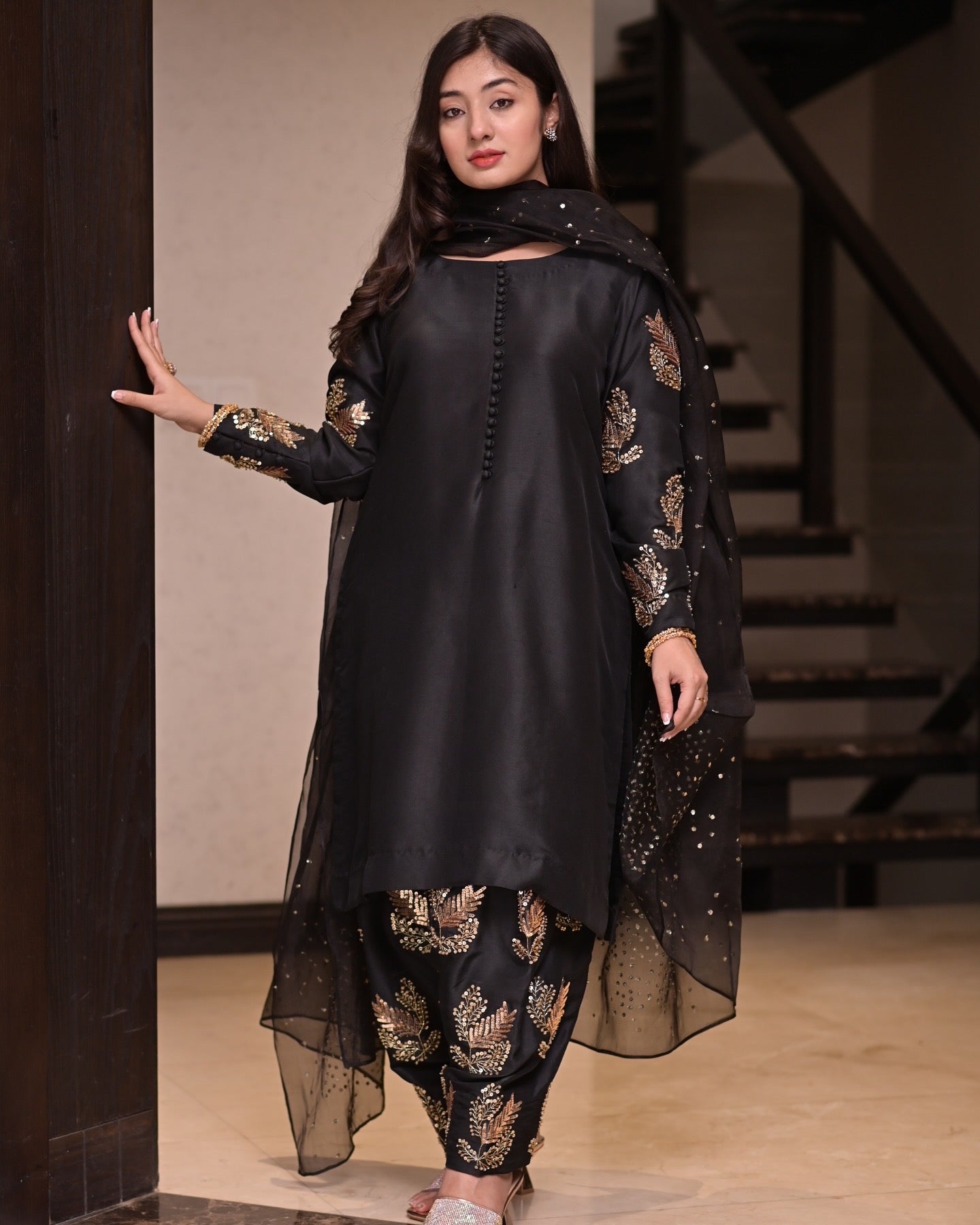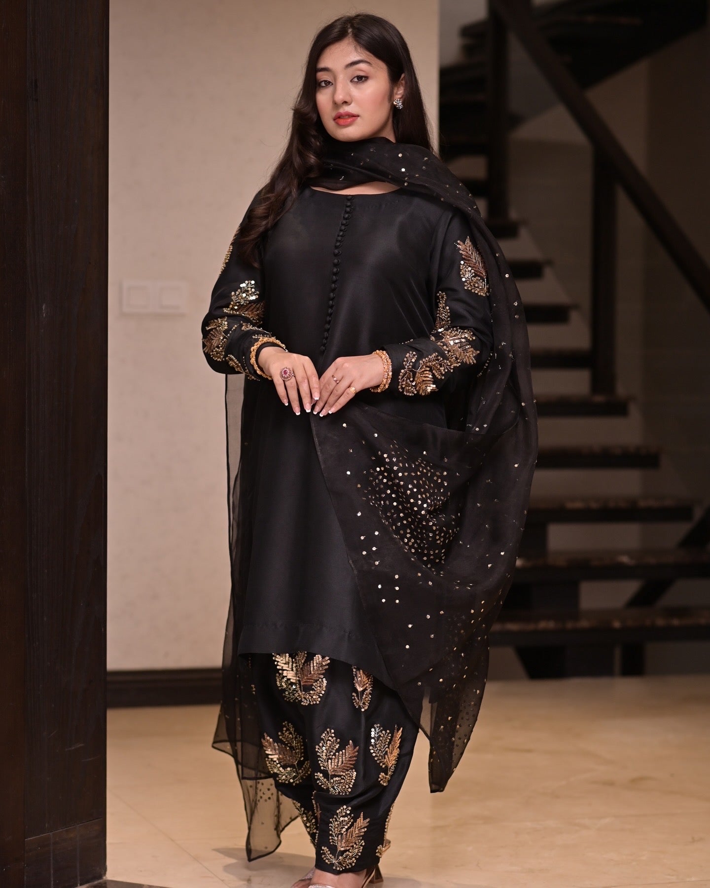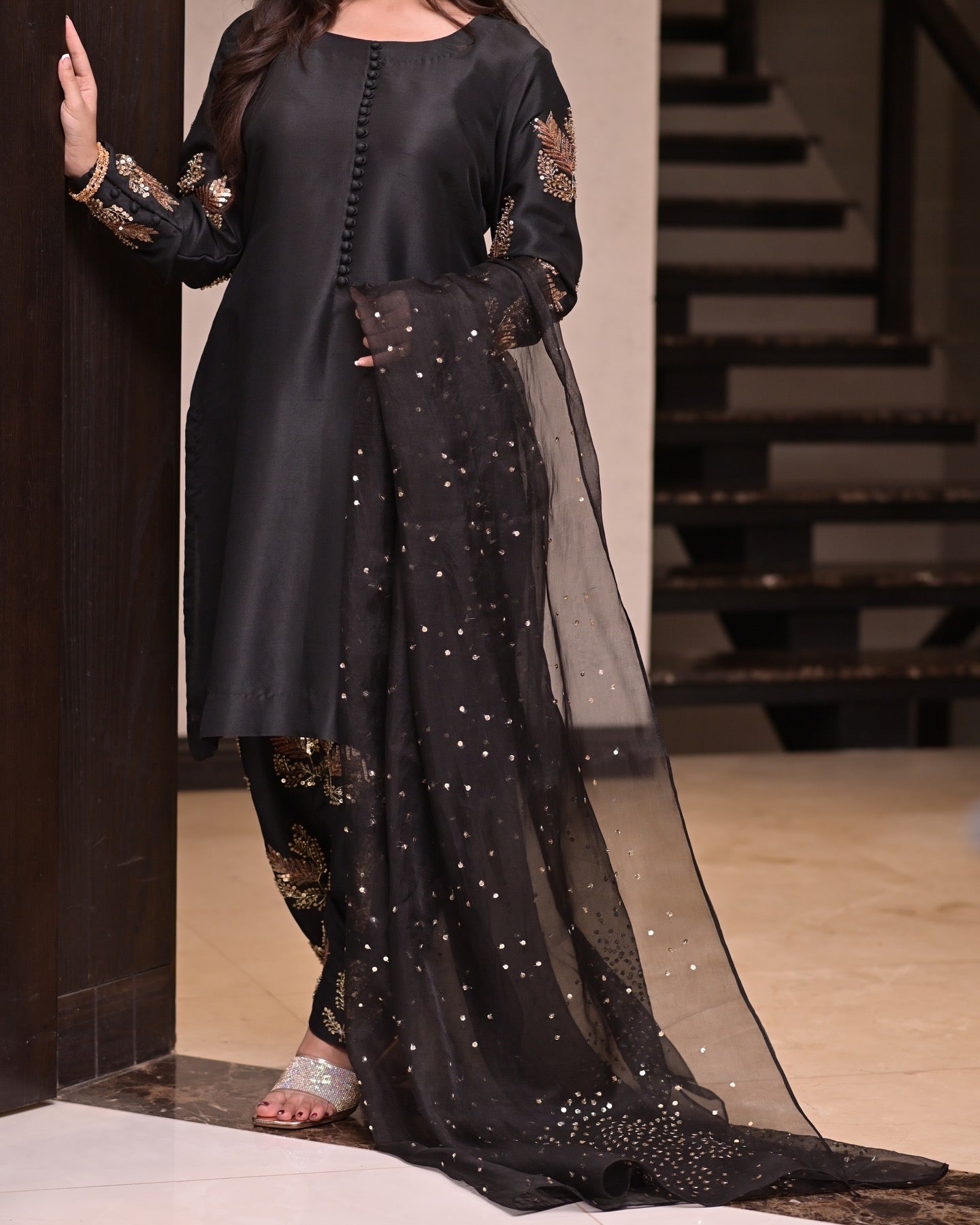 A timeless black raw silk outfit that shimmers with elegance. The dupatta and shalwar are delicately adorned with sequins, creating a dreamy starry-night effect that’s both rich and graceful. Perfect for any occasion, this outfit blends classic charm with a touch of sparkle. Available in any colour of your choice to match your style.