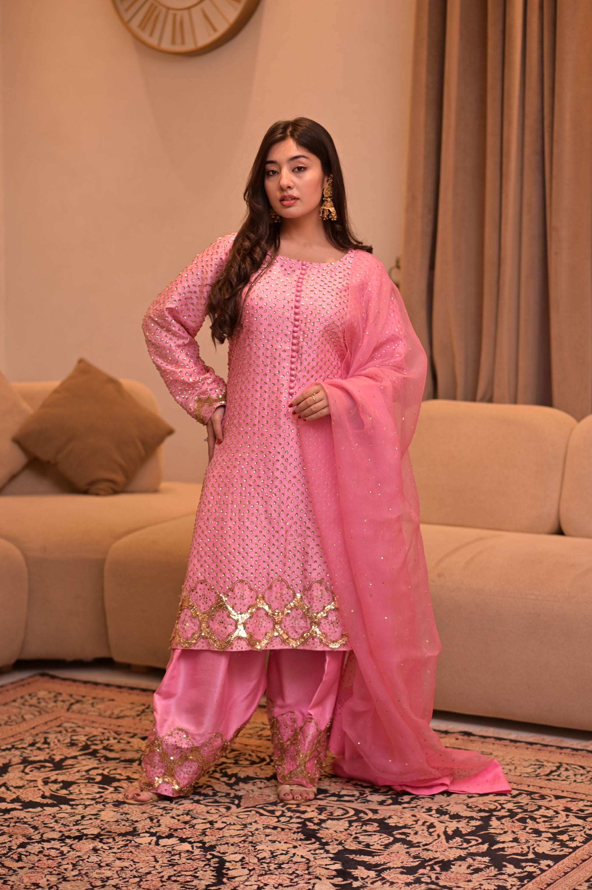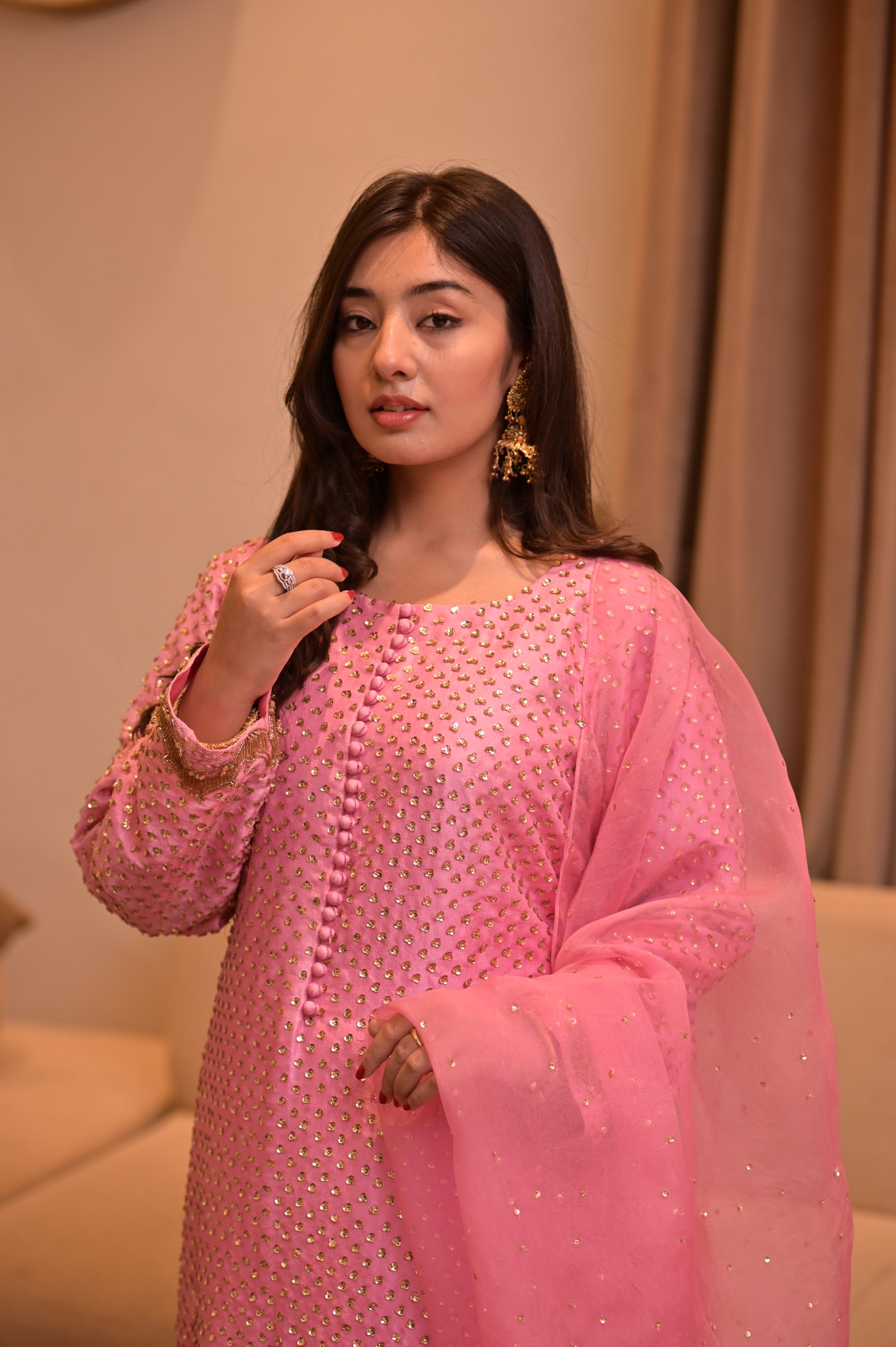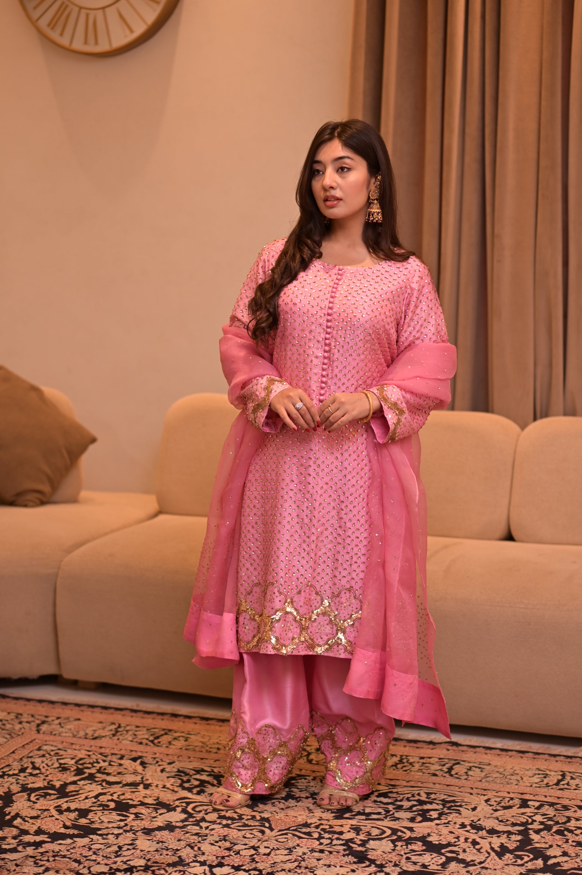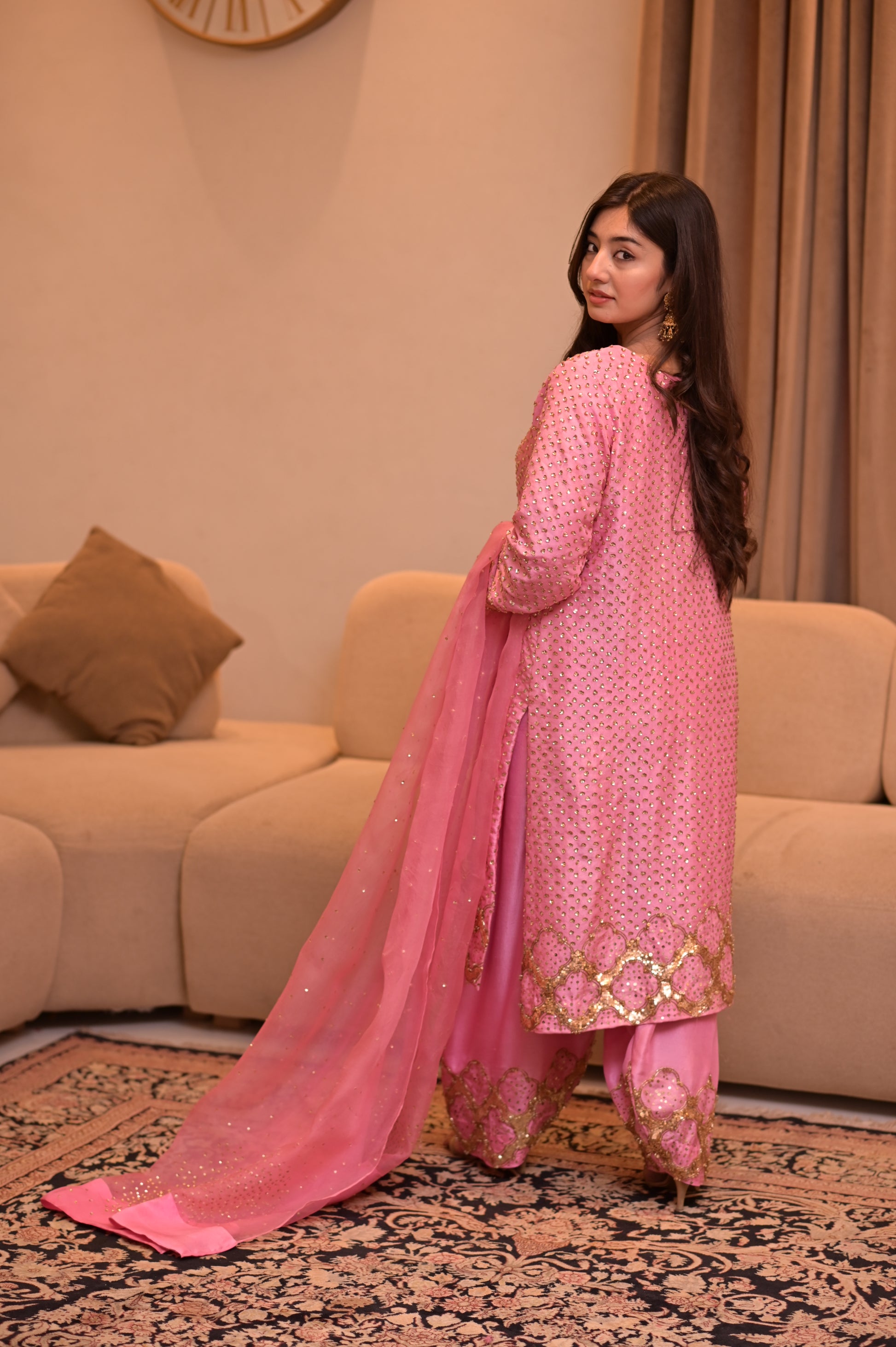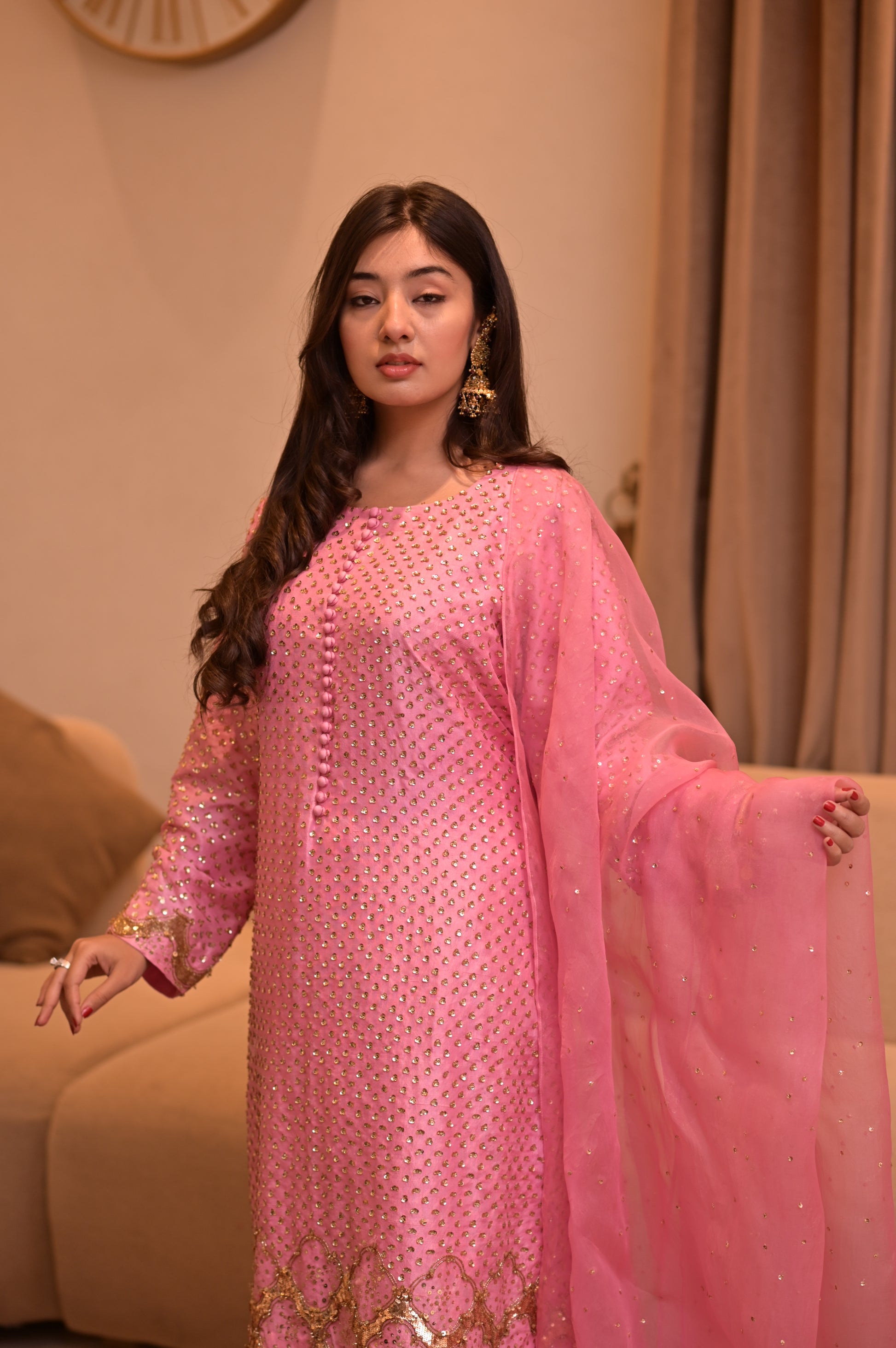 It comes paired with a stunning organza dupatta, delicately adorned with hand-sewn sequin floral designs. Every step you take makes the sequins sparkle softly, adding just the right amount of glamour without losing that graceful charm.