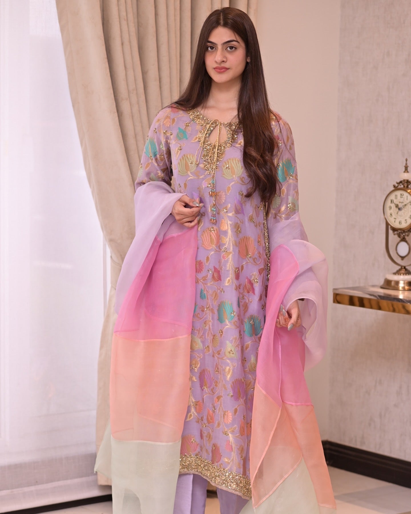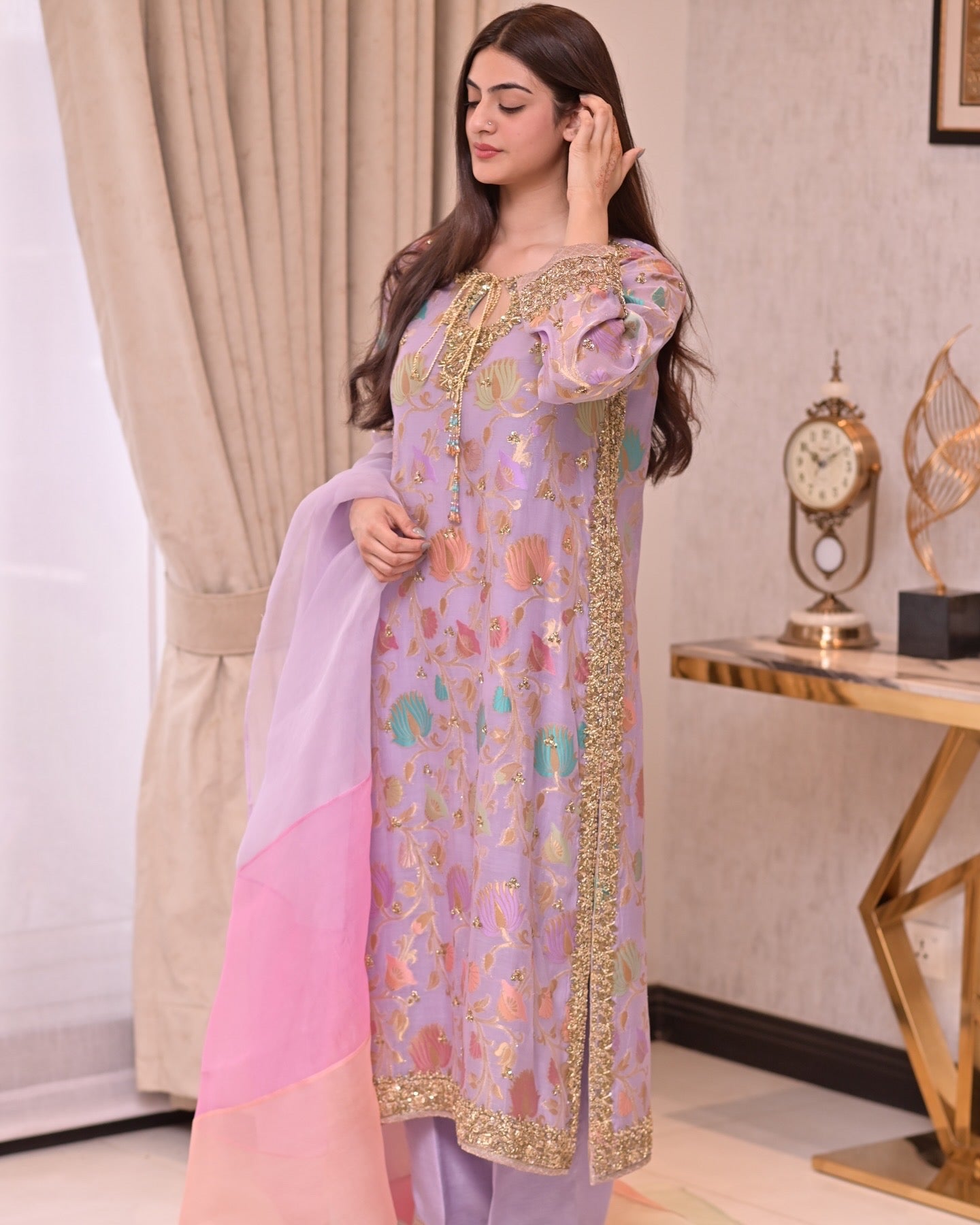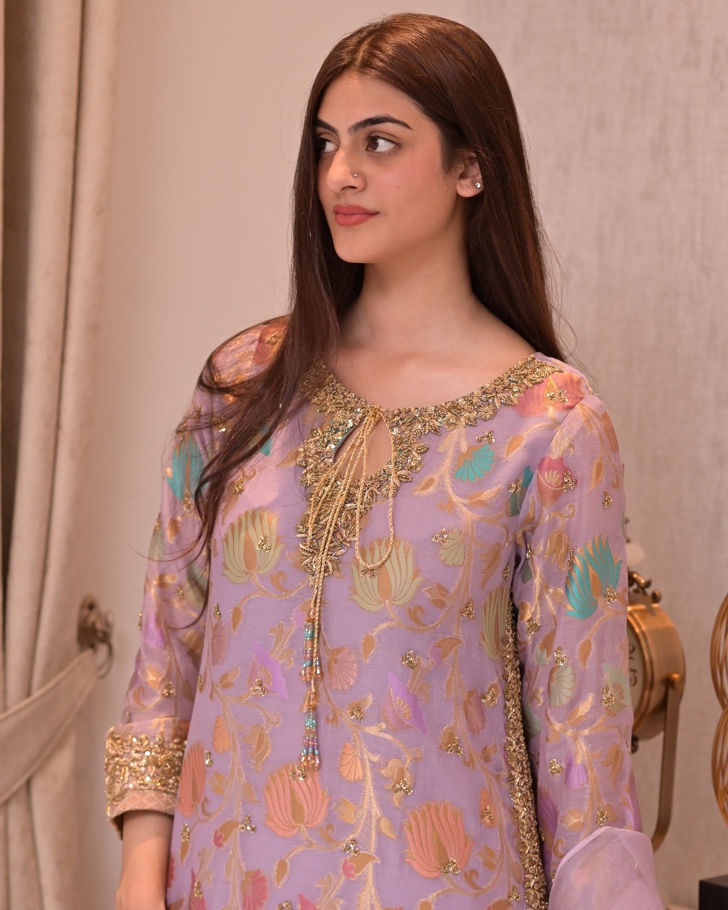 This embroidered Jamavar lilac suit blends traditional craftsmanship with contemporary elegance, making it a must-have for your next special occasion.